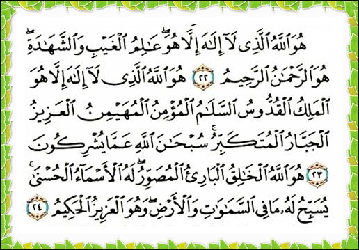 22. Dialah Allah, yang tidak ada Tuhan melainkan Dia; Yang Mengetahui perkara yang ghaib dan yang nyata; Dialah Yang Maha Pemurah, lagi Maha Mengasihani. 23. Dialah Allah, yang tidak ada Tuhan melainkan Dia; Yang Menguasai (sekalian alam); Yang Maha Suci; Yang Maha Selamat Sejahtera (dari segala kekurangan); Yang Maha Melimpahkan Keamanan; Yang Maha Pengawal serta Pengawas; Yang Maha Kuasa; Yang Maha Kuat (menundukkan segala-galanya); Yang Melengkapi segala KebesaranNya. Maha Suci Allah dari segala yang mereka sekutukan denganNya. 24. Dialah Allah, Yang Menciptakan sekalian makhluk; Yang Mengadakan (dari tiada kepada ada); Yang Membentuk rupa (makhluk-makhlukNya menurut yang dikehendakiNya); bagiNyalah nama-nama yang sebaik-baiknya dan semulia-mulianya; bertasbih kepadaNya segala yang ada di langit dan di bumi dan Dialah Yang tiada bandingNya, lagi Maha Bijaksana. (Surah Hasyur: Ayat 22,23,24)